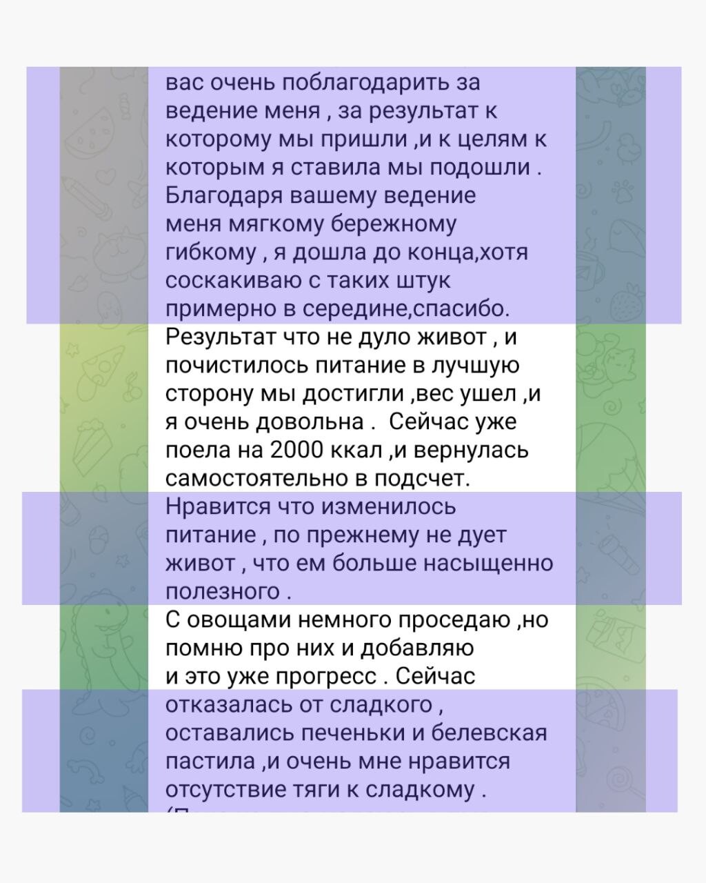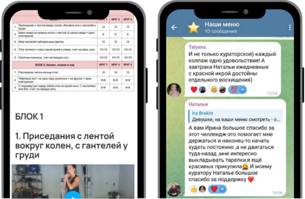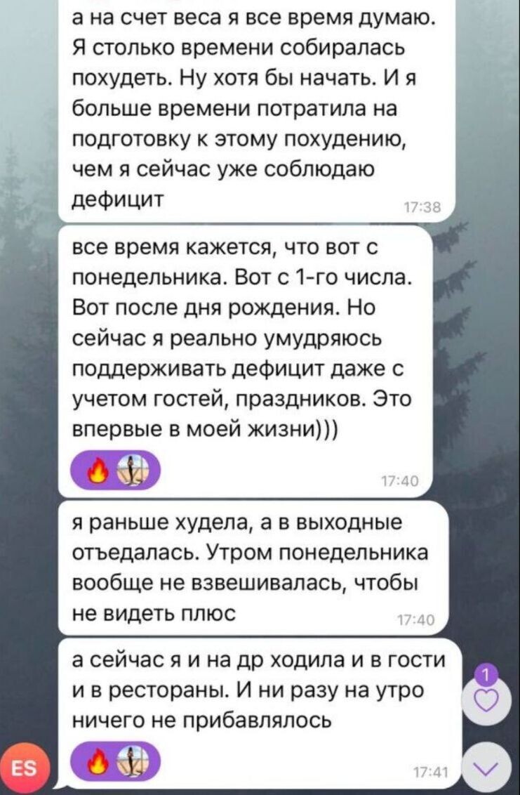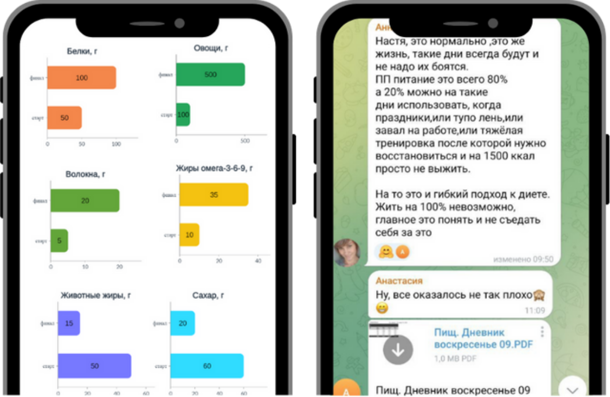 - Приложения: fatsecret — для дневника питания и telegram — в нем чат.