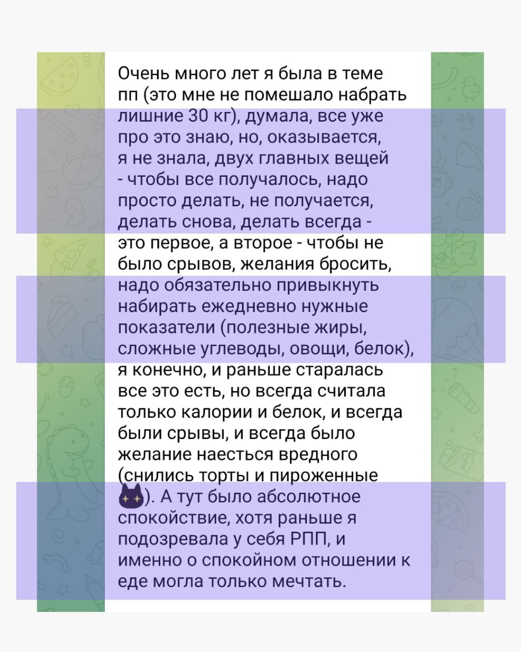 Мы чистим зубы, моем голову, стираем одежду вне зависимости от количества детей, фазы луны, погоды или рабочих авралов. Правильное питание должно стать тем же базовым навыком заботы о себе. И на его фоне вы продолжаете заниматься своей жизнью — воспитывать детей, работать, руководить, ездить в поездки и тому подобное. Да, вы не сможете три раза в день готовить себе красивые сложно-зожные блюда, но это не мешает худеть.